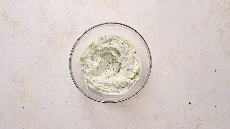 - Combine the yogurt, sour cream, Dijon, garlic powder, onion powder, chives, parsley, 1 teaspoon salt, and the cooked aromatics in a large bowl. Stir to combine.