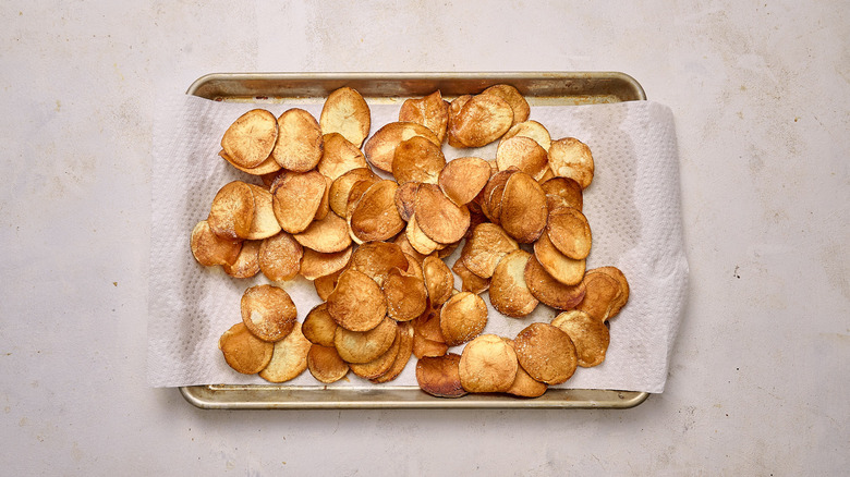 Remove the chips from the oil and drain them on a paper towel-lined sheet tray.