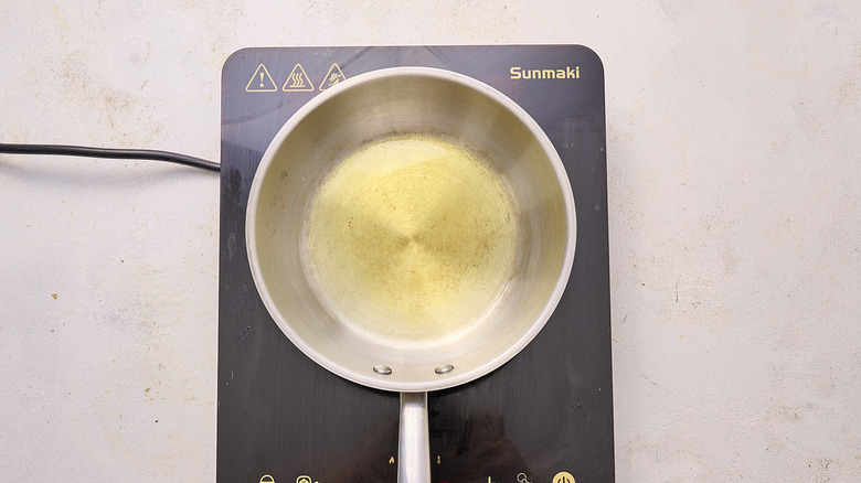 To make the dip, first heat the olive oil in a skillet over medium heat.