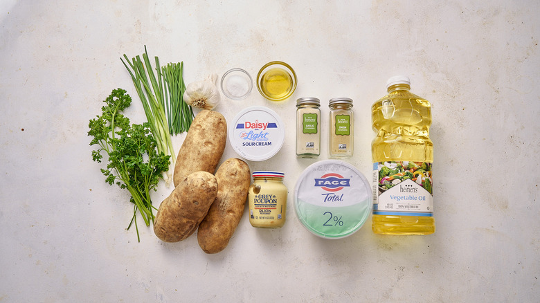 To make kettle chips, you only need Russet potatoes, salt, and frying oil. The most common oils to fry with are vegetable, canola, and corn, oils that are neutral in flavor and have a high enough smoke point to reach frying temperature. You'll need enough oil to at least fill your Dutch oven halfway, and if you have enough to fill the pot nearly full (but not quite to the top), you'll be able to fry even more batches. To make the dip, you'll need sour cream, Greek yogurt, olive oil, scallions, garlic, Dijon mustard, garlic powder, onion powder, chives, parsley, and a little more salt.