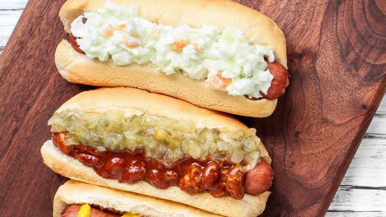 While the history of the Carolina-style hot dog isn't attributed to a specific year or inventor, the popularity of the North Carolina-style, or slaw dog, surged during the '50s and '60s. Many surmise that the toppings piled on this hot dog variety honor the older regional North Carolina BBQ tradition, which often features pulled pork sandwiches or plates served with onions and slaw. Apparently, the chili, slaw, and onion combination also extends to North Carolina-style burgers.