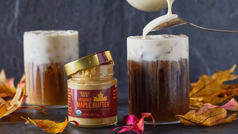 The arrival of fall brings colder temperatures, scarves, and the search for comfort in foods and drinks as the days grow shorter. And for those looking for an easy fix, Trader Joe's Organic Maple Butter comes to the rescue. This seasonal product made from reduced and whipped maple syrup couldn't be easier to spoon onto slices of fruit, spread across pieces of toasted bread, and even drizzle into your favorite coffee recipes. While a spoonful of the sweet, creamy stuff can easily be stirred into homemade cafe lattes, those not quite ready to let go of summer days can also use the ingredient to act as a bridge between seasons and build tempting iced coffee drinks.