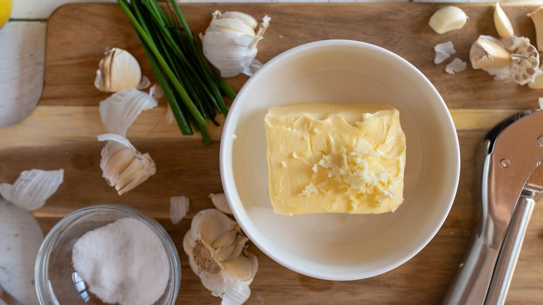 According to a YouTube video by Back-Yard Hibachi there are several types of garlic butter used at Japanese steakhouses, the most basic of which is a simple mixture of room-temperature butter and garlic cloves whizzed up in a food processor. However, you can easily prep a richer version by processing your garlic cloves with heavy whipping cream and salt first. This creates a salty, garlicky foam that's intensely pungent. Simply add this mixture to your softened butter and mix it thoroughly by hand in a large bowl or in a stand mixer. Once the two elements are thoroughly combined you can transfer your compound butter to a smaller bowl and pop it in the fridge for later use. Keen to amp up that savory flavor further? All you need to do is combine chicken seasoning, a dash of sake, and a sprinkle of hondashi to your prepped butter to imbue your steak with a complex, meaty taste.