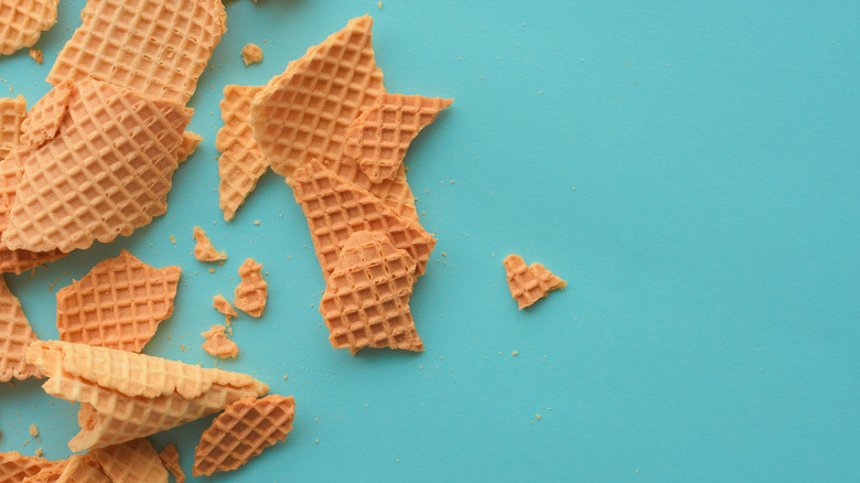 Leftover ice cream cones are more versatile of an ingredient than you may think. Not only can you use them as a vector for picking up a sweet dip, but you can also use them in your ice cream cake — both functionally and for decoration. Crumble up a bagful of ice cream cones and press the pieces into the bottom of your cake pan for an extra layer of crunch. Or, you can break up the cones into small shards and use them to decorate your cake. You can try and press the shards into the side of the frosting to create a scale effect, or make an avant-garde tower for the top of your cake.