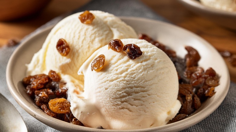 Everything is better boozy, including ice cream cakes. Instead of using a plain ice cream flavor, consider swapping in a boozy ice cream instead. The alcoholic addition will help call attention to the other flavors in your dessert, like vanilla and anything citrusy. If you're just experimenting for the first time, try using a rum raisin ice cream. Its mild flavor pairs well with a vanilla or a spice cake base.