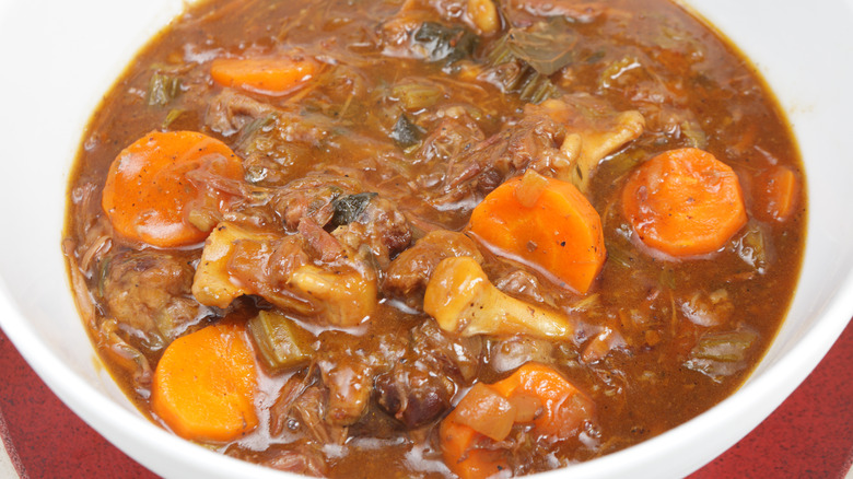 This flavor-loaded, slow-cooked dish is another warming stew that's deemed a nostalgic staple by many Brits. Oxtail stew brings out the best in an affordable cut of meat — the tail of the cow. Whilst this bone-in cut is typically tough, when oxtail is cooked low and slow, it becomes amazingly succulent and tender. Cook it correctly, and the meat should be falling off the bone.