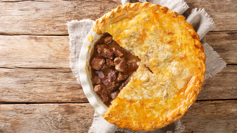 Despite the name, steak and kidney pudding is very much a savory dish, and thankfully, not an attempt to shoehorn steak into a dessert. Unlike steak and ale pie, which has a flaky crust, this dish is made with a suet pastry that is soft, moist, and usually steamed rather than baked. Inside, you'll find a hearty filling of diced steak, onions, and lamb or ox kidney cooked in a luscious gravy. The kidneys add a unique iron-rich bitterness that can be considered an acquired taste to some, but there's no doubt that this dish is deeply flavorful.