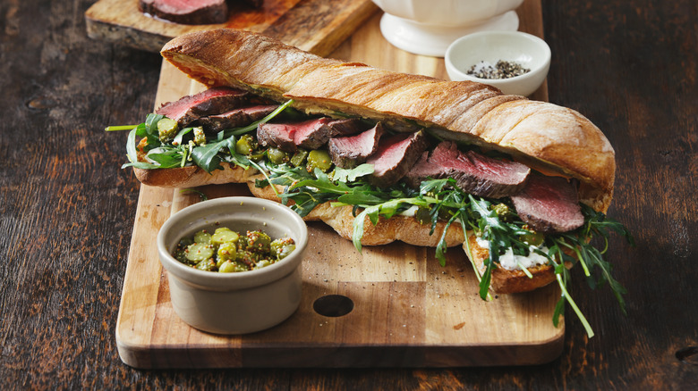 Philly cheesesteak move aside — there's a new take on the classic steak-bread combo to try. The steak sandwich is an option you'll often find on pub and cafe menus in the U.K., allowing you to ditch the steak knives by turning this much-loved meat into something you can eat with your hands. This dish generally features slices of juicy, well-seasoned steak served between slices of fresh, crusty bread or ciabatta. It's portable, satisfying, and easy to customize, too. The cut of steak can vary, but sirloin is a popular choice for its tender and flavorful nature. The meat is first seared or grilled before resting and slicing it thinly to fit snuggly into the sandwich.