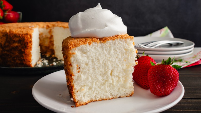 Both cakes have some room for customization and the addition of extra flavors. For angel food cake, those primarily come through toppings — syrups, glazes, fresh fruit, and occasionally whipped cream. Because of its delicate structure, you shouldn't use anything too heavy or moist. Finishing this cake with vanilla or chocolate glaze is popular, as long as you use it sparingly; too much moisture can ruin the cake's quintessential airiness. The safest and easiest way to add freshness (and color) to this light cake is to serve it with fresh berries and a light drizzle of sweet syrup over the cut slices.