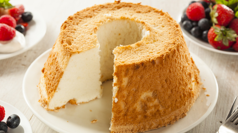 In contrast with Victoria sponge, angel food cake doesn't call for butter or any other type of fat. It's made by whipping the egg whites with sugar to essentially create a French meringue with stiff peaks. Cream of tartar can be added for more stability. The flour is then sifted and gently folded into the meringue, with the entire process focusing on preserving the delicate texture of this cake. The lack of egg yolks leaves the cake with a pale white color, while the absence of fat keeps it light on the stomach. The cake is baked in a tube pan that's neither greased nor non-stick — after it's baked, angel food cake is famously cooled upside down, so it's important that it sticks to the pan.