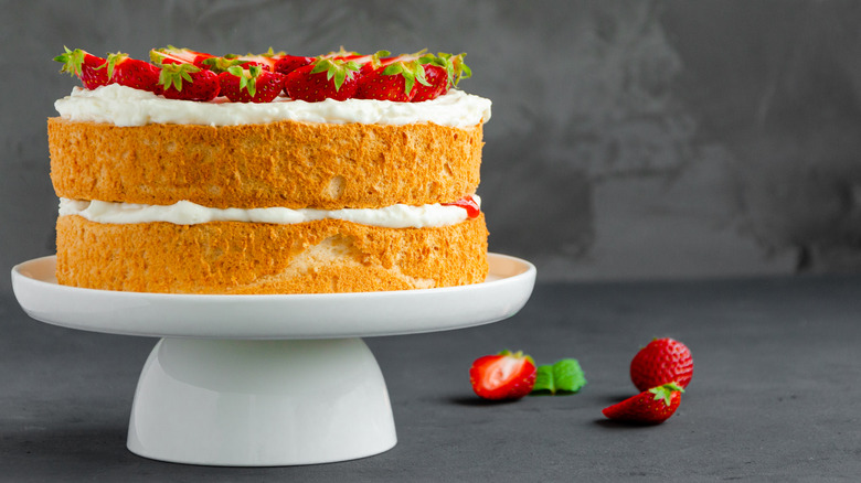 Angel food cake, in contrast, is very delicate. It has a fluffy, airy texture that makes it somewhat of a challenge to cut into slices, unless you're using a cake breaker — an antique tool that doesn't smush delicate cakes. It's best to eat angel food cake on the same day you make it because it won't retain moisture for long. This cake doesn't contain any fat, so it's quick to dry out. One of the ways to properly store angel food cake is to wrap it tightly with plastic wrap and store it in the fridge, so prolonging its shelf life. In comparison, the layers of Victoria sponge could last a couple of days, but the addition of perishable fillings calls for refrigeration, too.