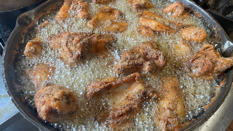 Southeastern Indiana is not exactly where you think of when you think of award-winning fried chicken. According to the James Beard write-up about the restaurant, "there is no recipe," just good 'ol farmhouse culinary tradition. The team behind the fried chicken at Wagner's relies on a modest ingredient list including chicken, salt, pepper, flour, and lard. Lard is a common fat used in old-school Southern fried chicken recipes, but what differs in the Indiana-style version of the crispy bird is the amount of black pepper used to season the chicken. Hint: It's a lot.
