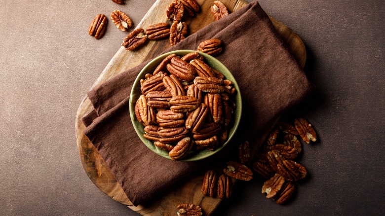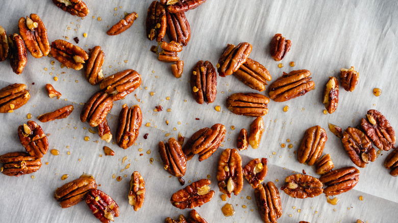 Toasting pecans on the stovetop is another great option to release the tasty natural oils found in nuts and improve their texture. Toasting pecans in a pan over medium-low heat for five to seven minutes reduces the risk of burning and can help you have better control over how toasted you'd like the nuts, as you're able to keep an eye on them directly, rather than having to open an oven door while roasting. It also gives you the ability to toss them frequently, which helps toast all sides of the pecans while they come in contact with the pan's hot surface. The next time you toast pecans, try adding them to your coleslaw for a rich, nutty crunch.