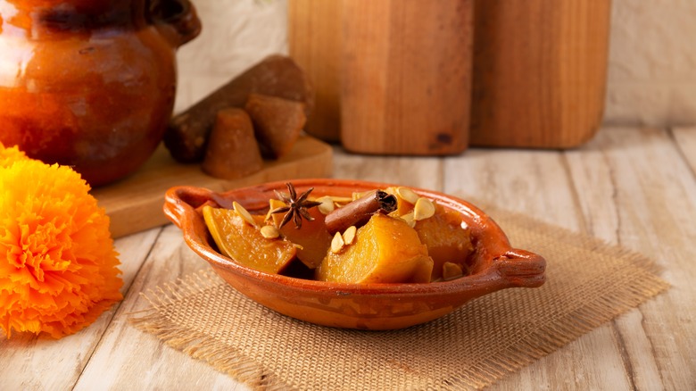 Candied pumpkin, which is a dessert referred to as calabaza en tacha, is another traditional Mexican treat. Similarly to arroz con leche, chef Wes Avila says of calabaza en tacha, "Both desserts draw inspiration from seasonal ingredients and spices that create that warm, cozy feeling we like for the holidays." In addition to Thanksgiving and Christmas, this dessert is typically served in celebration of Día de los Muertos, much like pan de muertos, when pumpkins are abundant. Because this gourd has been cultivated in Mexico for millennia, it's no surprise this dish is so popular.