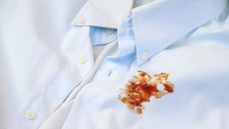 All too often, you finish eating and come up from your state of food bliss to see sauce on your favorite shirt. It's notoriously hard to get out — but not impossible. Go back to indulging in barbecue with reckless abandon, because with some distilled white vinegar, even the most stubborn stains don't stand a chance.