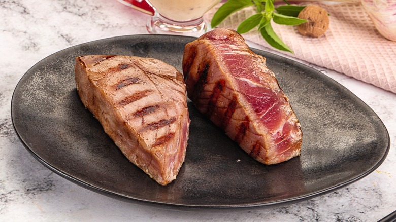 The grill isn't just for steak and burgers — it can also instill a smoky sear for fish filets. Tuna steaks are a great option for grilling, with similar firmness and density to a cut of red steak. That said, tuna takes much less time to cook than your average grilled steak or chicken. So we consulted an expert about how long you should cook tuna on the grill and signs of doneness. Sheila Lucero, the culinary director at Big Red F Restaurant Group and the executive chef at Jax Fish House & Oyster Bar and Centro Mexican Kitchen, told Tasting Table that grilling tuna steaks is a fairly foolproof process thanks to tuna's coloring.