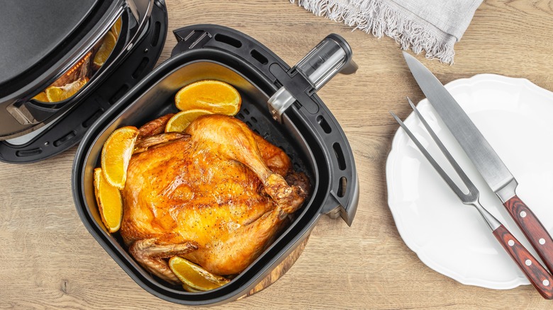 With the risks and hazards that can potentially arise from deep frying a turkey in a large vat of hot oil, consider air frying for a far less messy or dangerous cooking affair. Similarly to braising, Chef Brad Wise also doesn't recommend this method for your holiday bird. Still, air fryers are made to safely use in your kitchen. Requiring little to no oil, you can get crispy, golden skin on your turkey without the hassle of using gallons of oil. Air frying is a much safer option that gives you the opportunity to experiment with your Thanksgiving turkey without burning down your house in the process. Frying without oil also makes for a quick and easy cleanup.
