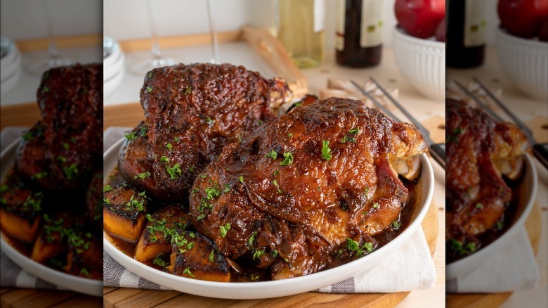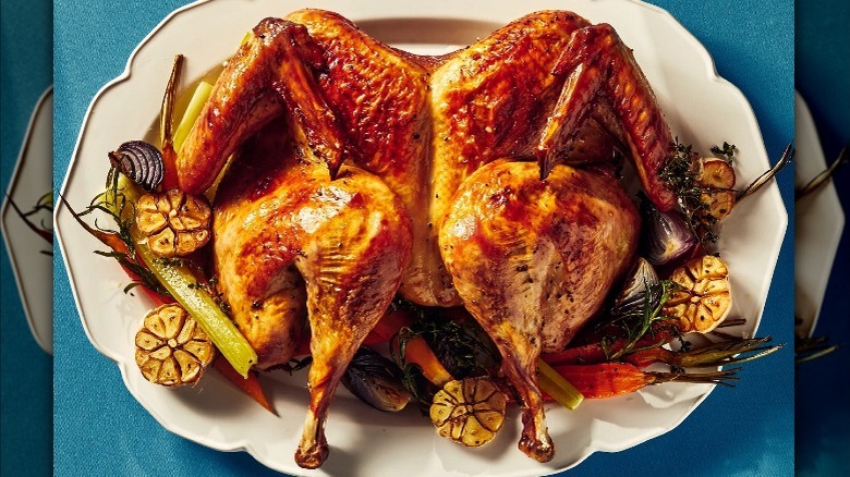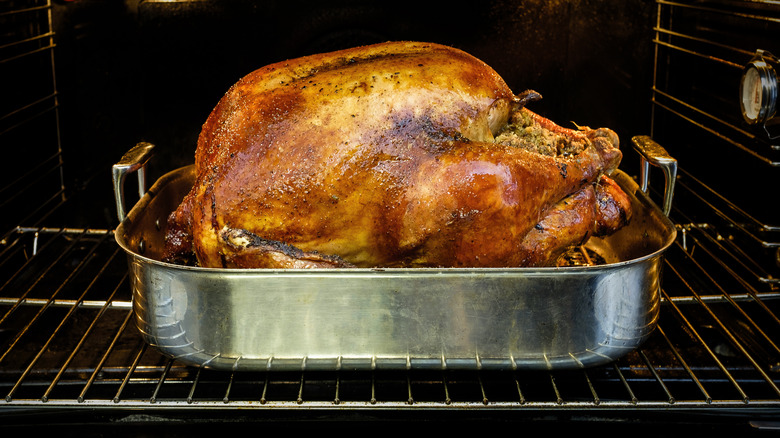 Braising is a low-and-slow cooking method that's similar to roasting, except it requires cooking food — in this case, your Thanksgiving turkey — in liquid. Your turkey rests in at least a few inches of water or broth to help keep the bird moist while it cooks. Spices and herbs are typically added to a braising liquid to impart subtle flavors and seasoning. You can even add other foods like carrots, onions, garlic, lemon, or oranges to your liquid base, so they simmer with the turkey. Though it's common to sear meat before or after braising, it doesn't achieve the same crispy, caramelized skin on the turkey as you see with a dry roast.