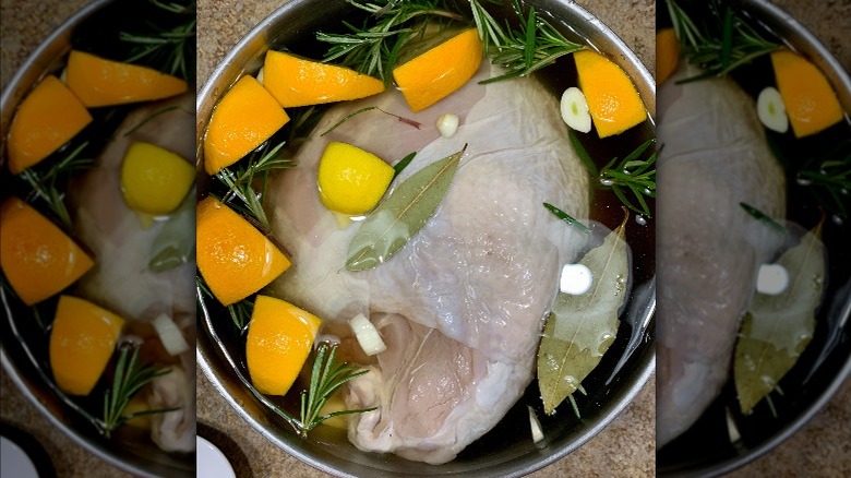 Brining may not be an actual cooking method, but it is a popular prepping method that can drastically change how your turkey is cooked. Brining is either wet or dry, and it works to add flavor and moisture to the food you're cooking. Both variations require salt, which is the key factor to pulling moisture into the meat. A wet brine calls for submerging your turkey in a seasoned, salty solution, so make sure your pot is large enough to hold a large amount of liquid — water or broth — as well as the turkey.