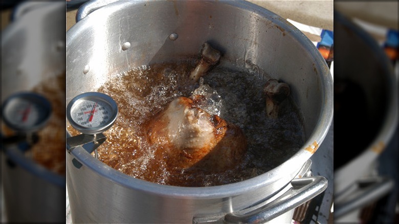 Deep frying a turkey may sound intriguing and yet terrifying at the same time. The sheer size of a whole turkey and the amount of frying oil needed is enough to make anyone think twice about cooking their Thanksgiving turkey this way. And indeed, good sense says you should think twice about deep frying your turkey. It can be dangerous, says chef Brad Wise, who notes, "The obvious cons are injury and/or damage to your house." In fact, doing it wrong can cause a major catastrophe, according to the U.S. Consumer Product Safety Commission.