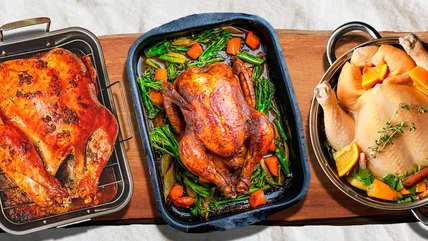 For those who spend Thanksgiving in a warmer climate or are among the many who cook out no matter what the weather is, grilling is another cooking option for your Thanksgiving turkey. What better way to celebrate the holiday than by cooking over an open fire? Grilling achieves a crispy, charred exterior that gives the turkey meat a deeper, heartier bite. As an added bonus: You won't heat up the kitchen and potentially overheat your guests if you opt for this cooking method.