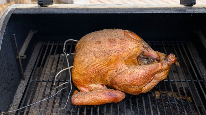 But before you go this route, make sure the size of the turkey you need fits well on your grill and that you can safely close the lid. When you prep the turkey before grilling it, be generous with a good cooking fat like butter or olive oil, which aids in the meat retaining moisture and the skin becoming crispy and caramelized. A convenient way to grill your Thanksgiving turkey is to get yourself a rotisserie attachment. The rotisserie rod, such as this popular Char-Broil Universal Electric Rotisserie on Amazon, does all of the work for you, as it slowly spins the turkey round and round so it bastes itself while cooking.