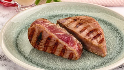 If you have a trusted seafood counter or fish market where a fishmonger can do the work, simply ask for the tuna steaks to be cut between one and two inches thick. If you prefer to cut the fish yourself, we've got some tips. Start with the whole piece of tuna and pat it dry with paper towels first. The best type of tools to use include a tuna, filet, boning, or other serrated knives so it cuts smoothly through the flesh without leaving marks. Slow and steady wins the race so the tuna steaks are cut evenly in thickness to ensure it cooks well.