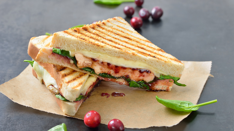 The sweet tang of cranberry sauce is mostly experienced post-Thanksgiving, eaten along with leftover pies and candied yams. Though the traditional extent of experimenting with the side is putting it on sliders made from turkey and dinner rolls, it's great at enhancing other sandwiches, too. Cranberry sauce's bold taste works wonders as a delicious addition to elevate your grilled cheese. The fruity sauce embraces the savory aspects of cheese while lifting the sandwich with a bright, acidic pop.