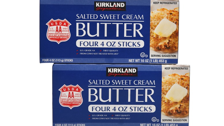 Costco might do everything big, but unfortunately for customers, that also includes recalling 80,000 pounds of Kirkland Signature butter. Thankfully, unlike recent recalls of Costco's Kirkland Smoked Salmon, this isn't about any illnesses or bacteria like listeria and is instead simply a case of a product being mislabeled, but it is still worth being careful with. The butter being recalled was sold exclusively in Texas, and according to a Food and Drug Administration report on the recall, 2,100 cases of the butter were shipped without proper allergen information being listed on the packaging.