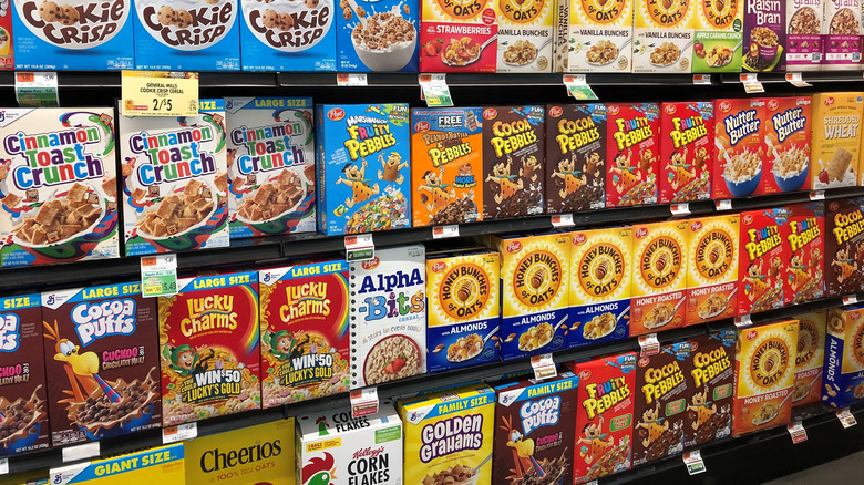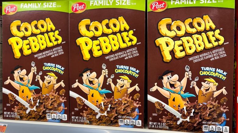 If there's one thing America does really well, it's creating timeless, sugary, and colorful breakfast cereals — and if you've ever visited an American cereal aisle, you know that this is true. Cereal is a deeply nostalgic food for many people, and while this makes it a tempting purchase, the majority of them have actually been deemed unhealthy by the FDA due to their large amount of sugar. Even those cereals that claim to be healthy or good for you, like Raisin Bran and Special K, do not qualify as healthy. Their boxes claim to have health benefits, but these aren't always true, and if they are, they probably don't mean much for your health in the long run. The Flintstones-inspired chocolate Cocoa Pebbles cereal box, for example, claims to have "real cocoa," but a 2019, class-action lawsuit revealed that this isn't necessarily true.