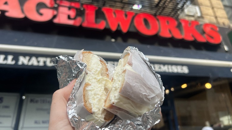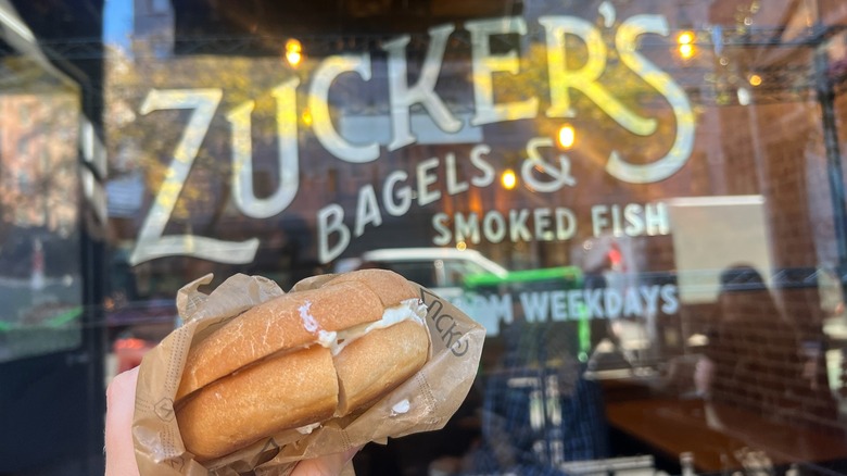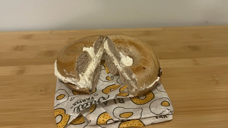 As soon as I pulled the bagel out of the to-go bag, I was extremely disappointed. It honestly looked completely sad — it was flat, had zero shine to the exterior (while every other bagel at Zucker's has the telltale shiny crust), and it looked completely dry. As I took my first bite, I was taken aback by the texture. At first, I noticed that it was a bit airy. After a bigger bite, I felt like I was actually chewing on a piece of a sponge. It was completely unpleasant.
