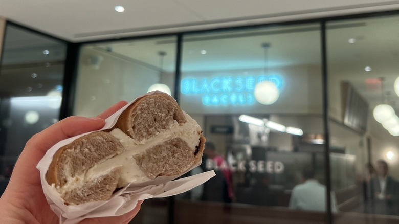 Black Seed Bagels is one of the nicer, more popular bagel spots in the city. It wraps up each bagel in its branded wrapping paper, puts the bagel in an aesthetic bag, and feels very modern. There are 10 locations throughout New York City, ranging from Midtown Manhattan, Lower Manhattan, and even Brooklyn. When comparing the Black Seed gluten-free bagel to the other bagels I tried, I will say that it fits into the small size category. However, it wasn't thin like many of the other small bagels were. Instead, it had about double the thickness of the other bagels and had a nicely shiny exterior.