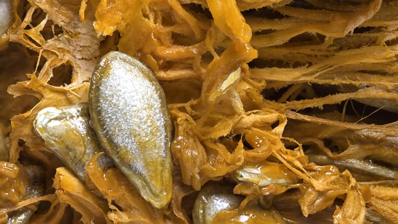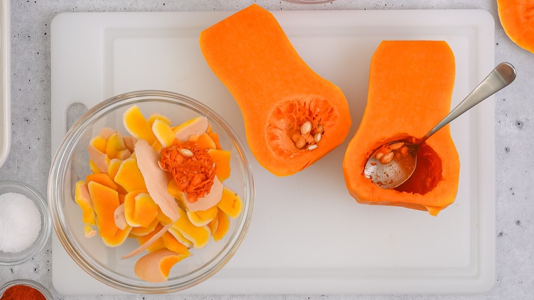 When in season, butternut squash is one of the cheapest items at the produce aisle, but what if we told you could get even more value out of it? Every part of this versatile vegetable is edible, packed with nutrition, and can stretch your dollar even further. The seeds make for a tasty and nutrient-packed snack, but you'll need to prep them first. If you're looking for the easiest way to remove squash seeds, we've got you covered. Grab an ice cream scoop (or a regular spoon), and scrape your way through, as if using a melon baller. Place the seeds in a mesh sieve and rinse thoroughly to remove the slimy pulp. Let them dry and roast in a single layer for 20-25 minutes at 325 degrees Fahrenheit.