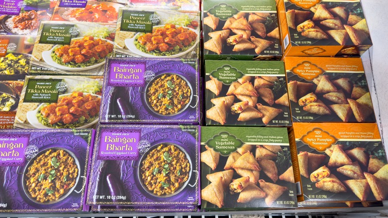 Between its famous rotation of seasonal snacks and its cult-favorite collection of condiments, it's no wonder Trader Joe's has become a mecca for affordable and (mostly) additive-free groceries. And while you'll find gems from the bread aisle to the produce area, most fans of the grocery chain can agree that Trader Joe's frozen food section is what really sets it apart — and we're not just talking about its ultra-convenient layout. It's stacked with an impressive selection of heat-and-eat entrees that have earned a cult following of their own, and that includes its lineup of vegetarian-friendly bites.