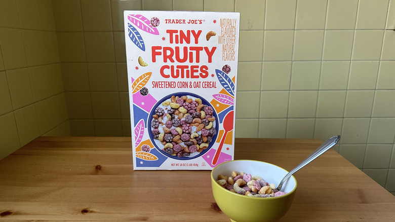 Let me preface this by saying that I've never been a fan of fruity cereals — not even when I was a kid. Therefore, I may be biased when I say that Trader Joe's Tiny Fruity Cuties were my least favorite cereal of the bunch I tried. It's simply too sweet and fruity to actually eat a whole bowl of the stuff. That being said, I did find the flavor quite a bit milder than most of the other fruity cereals I've had. Plus, apart from that sweetness, the flavor isn't all too bad, and chances are that kids are going to love it.