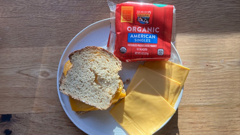 When someone reaches for a package of American cheese to prepare an oozy, gooey, creamy grilled cheese sandwich, they usually aren't looking for a health-forward lunch. That said, choosing American cheese doesn't have to mean choosing a dairy product with no regard for health or environmental concerns. Horizon Organics, which makes other dairy products like butter and milk, offers an organic alternative to conventionally-produced processed cheese. Horizon Organics' milk is sourced from pasture-raised dairy cows that eat a GMO-free diet, meaning you can enjoy your slices of American cheese with the knowledge that you're eating organic cheese.