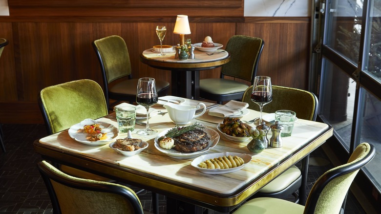 Located down at Pier 17, the Tin Building from Jean-Georges is a delicious addition to the neighborhood. Take a walk around the space to ogle at all the fresh meat and fish, cheese, candy, and baked goods, and then eat at T. Brasserie, where the $108 three-course prix fixe is ready to take you on a French-infused culinary journey. Start your meal with French onion soup or steak tartar, and then move to the main course. A classic Thanksgiving spread is available, complete with roasted turkey breast, chestnut stuffing, cranberry compote, Brussels sprouts, and mashed potatoes. If sticking to tradition isn't your vibe, opt for a Faroe Island salmon, pan-seared pork sausage, or the 16-ounce New York strip. Finish off the meal with a slice of pumpkin pie, crème brûlée, or profiteroles.