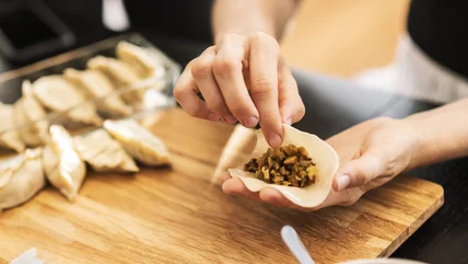 If you've finished cooking and flavoring your filling and it still seems too wet — do not worry, there are a number of things you can try to dry out the stuffing. Our favorite trick is adding a little bit of an absorbing agent like cornstarch or breadcrumbs which will latch onto the leftover moisture and help bind your filling. Once you're certain that your filling isn't going to contribute to an overly soggy wrapper, you're ready for folding! Just remember not to overfill your wrapper and you're on your way to perfectly shaped dumplings. And if you make too many dumplings, never fear, they can easily be frozen and reheated at a later date.