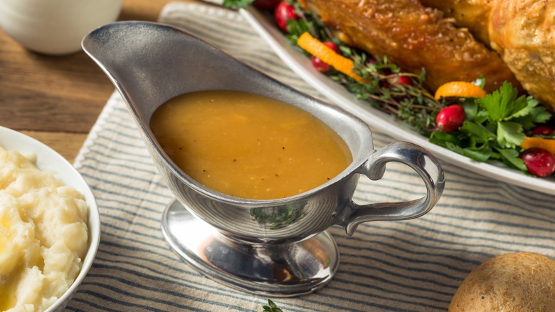 We spoke with food blogger and recipe creator Nadia Aidi recently at NYCWFF's FoodieCon, and she has a genius tip for avoiding dry leftover Thanksgiving turkey sandwiches, and it comes down to the gravy. Aidi, told us, "I thin out the turkey gravy a little bit to make it more like an au jus. I make my turkey gravy with caramelized onions, so there's a lot of au jus notes in there." She then enjoys her turkey sandwich much like a French dip sandwich, with a turkey gravy au jus for dipping.