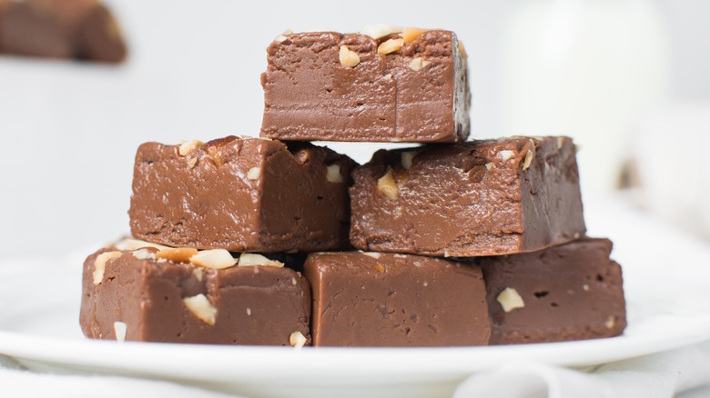 To get the lowdown on these varying methods, we turned to bean-to-bar chocolate specialist Preston Stewart, Director of Chocolate at Onyx Coffee Lab and Project Manager for Terroir Chocolate. According to Stewart, one of the best processes for beginners is called "cheater" fudge, and it's "the kind made with marshmallow fluff that is more forgiving ... the recipe can usually be found on jars of fluff." To make this type (which is also called fantasy fudge), melt sugar, butter, and evaporated milk together over the stove (while stirring constantly). Then boil everything for five minutes, take it off the heat, and stir in chocolate chips, any flavorings, and an entire jar of marshmallow fluff before cooling your fudge in a baking dish.