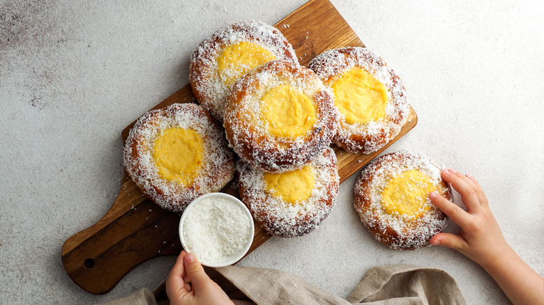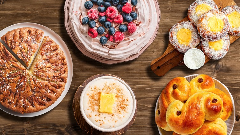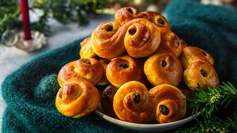 Lussekatter, though Swedish in origin, are a staple dessert across Scandinavia. Otherwise known as Swedish saffron buns or St. Lucia buns, and a St. Lucia Day treat enjoyed by celebrity chef Marcus Samuelsson, this fragrant dessert consists of swirled dough with a beautiful golden hue from saffron. In a humorous reference to the buns' unique shape, lussekatter translates to "Lucia's cats," and there's no denying the resemblance of these S-shaped buns to a cat's curled tail. Best eaten on the day they're baked, you can nevertheless freeze leftover lussekatter for future delight. Nevada Berg also suggests transforming leftover buns into bread pudding.