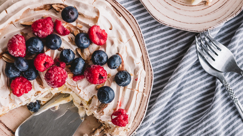 Otherwise known as verdens beste, or "the world's best cake," Kvæfjordkake is indisputably one of Norway's most popular cakes. It's primarily served on special occasions, such as weddings, birthdays, baptisms, and Norway's National Day. Like so many other Norwegian cakes, Kvæfjordkake builds upon a foundational recipe of sponge cake. However, the actual structure of this cake is fascinating: An almond-studded, airy layer of meringue sits on the bottom, followed by a layer of sponge cake, then a rich custard cream, then another layer of sponge cake, and, to top it all off, a pretty top layer of meringue. Recipes typically forgo a baking pan, rendering Kvæfjordkake a free-form cake and giving it a distinctly homemade aesthetic.