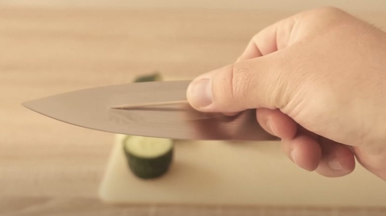 Cooking is a craft, but this tip turns it into a bit of a craft project. All you need is a toothpick and some tape. Start by pulling out a piece of adhesive that's a little bit longer than your toothpick — about ¼ inch on each side should be just fine. Line the tape, non-sticky side down horizontally on your counter, then place the toothpick, horizontally as well, to the sticky side. Your wood strip should be completely covered by the adhesive. Next, stick your toothpick-tape combo to one side of your knife, being extra careful around the sharp edge. Now, you're ready to rock (or slice, rather).