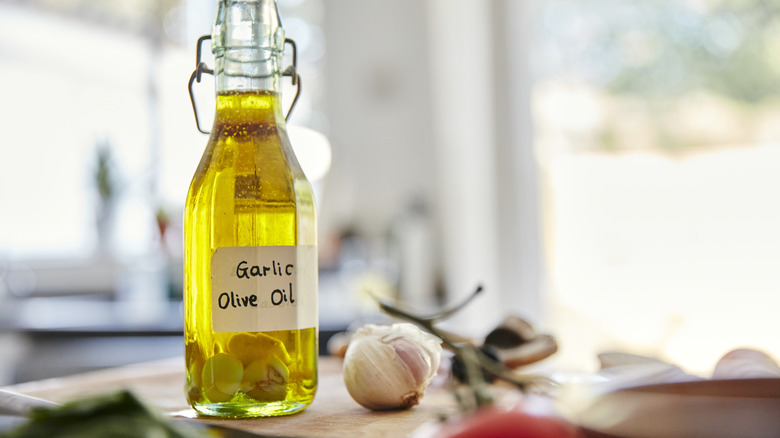 While you can purchase a bottle of garlic-infused olive oil from the store, many folks will try to make their own to cut down on costs. But, according to the United States Department of Agriculture, suspending garlic in oil and leaving it at room temperature opens up the opportunity for botulism to flourish. These toxins do not alter the flavor of the oil itself, which means that you could accidentally make yourself sick by consuming it. In order to avoid this risk, Michigan State University Extension recommends storing the oil in the fridge and using it within a few days of making it.