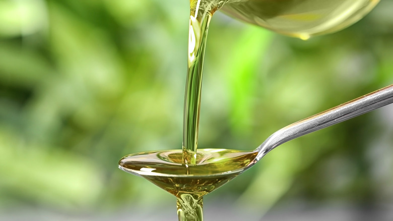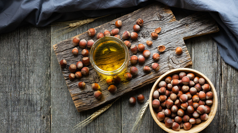 Hazelnut oil, unlike many of the fats on this list, is suitable to use both as a finishing oil and for cooking. It has a smoke point of around 430 degrees Fahrenheit, which means that you can use it for most of your culinary tasks. This oil has a flavor that's similar to sesame oil, with stronger sweet notes and a more delectable nuttiness. Its flavor makes it one type of oil that's tricky to work with, as you most likely only want to impart a slight hazelnut flavor and aroma to your dish rather than walloping the whole thing with it. If you find the flavor and pungency of this finishing oil to be overwhelming, you may want to try cutting it with a bit of extra virgin olive oil before you turn it into a salad dressing.