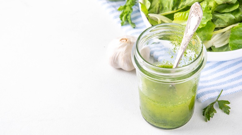 Herb oil is a great way to infuse all of your favorite fresh flavors, like parsley, cilantro, and tarragon, into a spread that's easily drizzlable. The herbs are combined with high-quality olive oil in a container; then, they're left to infuse over time. It's recommended that you blanch the herbs right before you blend them with the oil, as this will ensure that their color remains super bright. You should also stick to leafy, soft herbs — so skip the stems of rosemary and thyme. The fact that you can use herb oil as a recycling bin for your leftovers is great news for folks who tend to stock up on fresh herbs only for them to go bad in the back of the fridge.