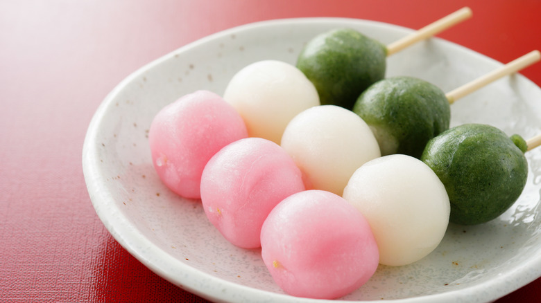 In its simplest form, dango is a dumpling that can be made from different types of rice flour. The dough is formed into ball-shaped dumplings sweetened with sugar and syrup, among other things, and served on a stick with three to five balls. Dango is sometimes compared to the perhaps more well-known Japanese dessert, mochi. Although they share similarities, mochi is traditionally only made with pounded rice.