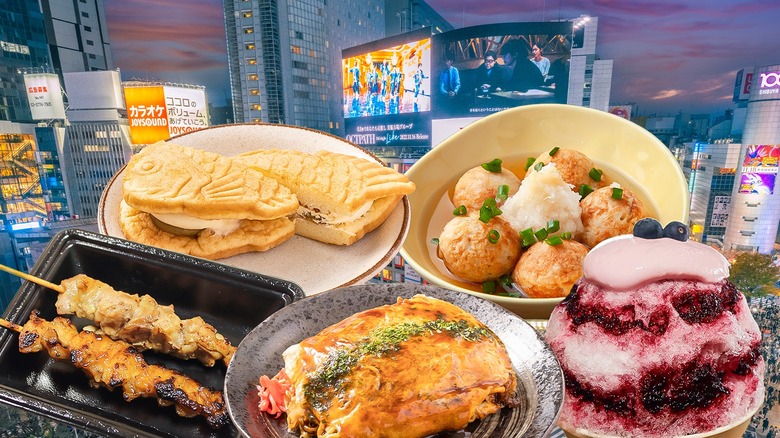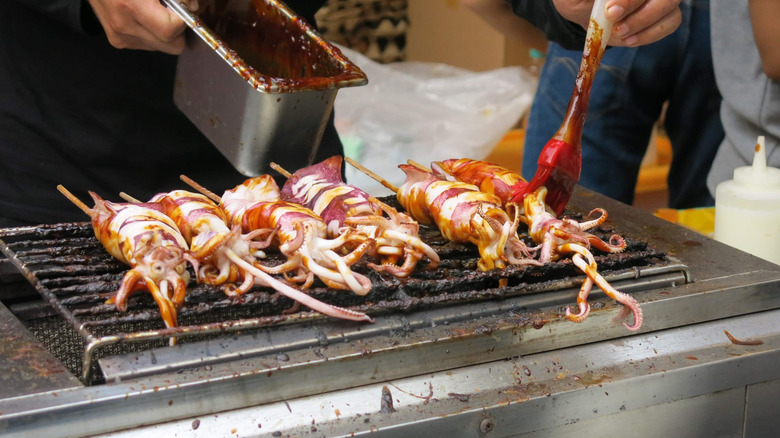 Skewers of meat or veggies are brushed with a sweet soy sauce-based marinade. The exact yakitori sauce varies, but at its base, it's typically a blend of soy sauce, sake, mirin, and brown sugar. Although there are now entire restaurants dedicated to the art of yakitori, these grilled skewers remain a top choice of food from the street. Don't hesitate to order a Sapporo as well, as these pair dangerously well with a beer or two.