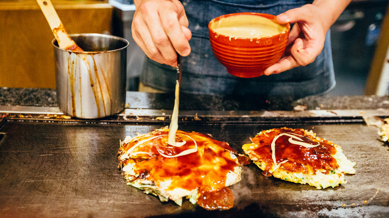 Topping the grilled okonomiyaki is the final, and perhaps the most fun, step. This, too, is highly variable. Popular toppings include okonomiyaki sauce, an umami-rich sweet concoction that can be bought in the store or made with oyster sauce, soy sauce, sugar, and ketchup. Japanese mayonnaise, dried seaweed, bonito flakes, kimchi, mushrooms, veggies, and shiso leaves, are just a few of the other additions that can be made to this filling, delicious dish. If you're feeling adventurous, okonomiyaki can be fun to try in your home kitchen.