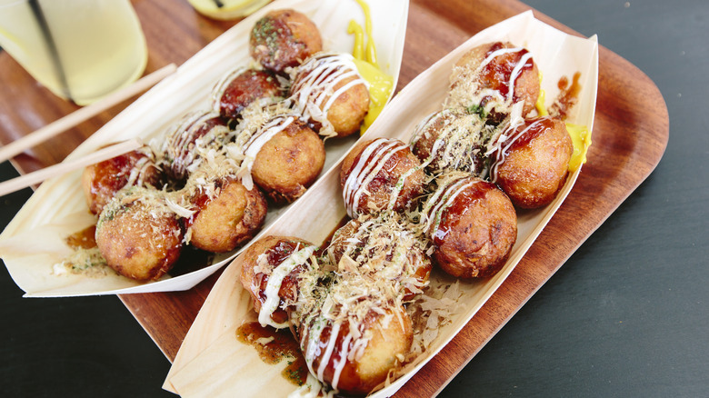 Sometimes simply called octopus balls, Takoyaki made its way onto Japan's street food scene around 1935. These round dumplings originated in Osaka and eventually spread to other areas of Japan. Gaining popularity over the years, Takoyaki now dominates Japan's street food scene and can be found at food festivals and yatai carts across the country. These octopus-filled dumplings can also be found in dedicated shops and at supermarkets and convenience stores.